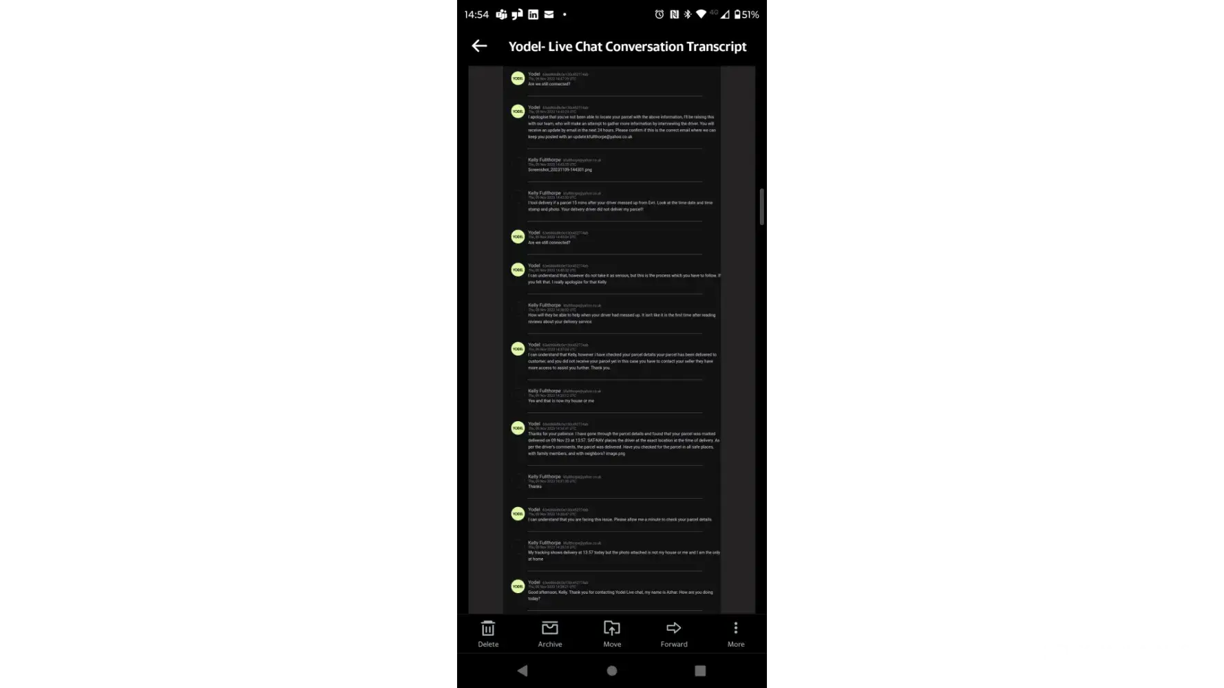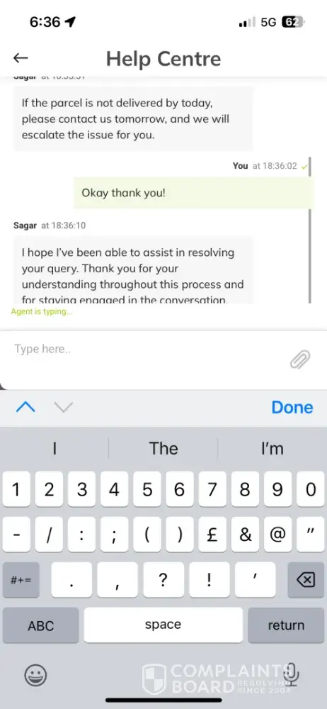 To add insult to injury, I experienced connection issues during the webchat conversation, even though my WIFI was working fine. It was clear that Yodel was having a difficult time handling their customers. It is truly disappointing that I had to deal with such terrible service, and I can honestly say that it was one of the worst experiences I have ever had with a courier company. I hope that they can improve their services in the future, as no customer should have to endure such a frustrating experience.