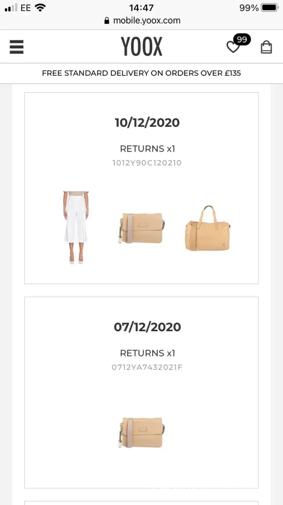 I decided to return both of the same items I bought, but I couldn't because the return request for the non-refunded order was blocked - YOOX made it themselves. When I tried to open it, it said I couldn't return any more items (even though I hadn't returned any). I contacted customer care again, and they asked me for photos of the item and the code. I didn't see the point of that, but I sent them anyway.