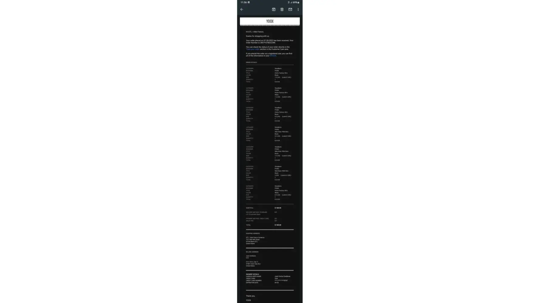 El dia de hoy 28 de jul. de 2022 7:13 a. m. Realizé una compra a la empresa YOOX por medio de la aplicación, el valor exacto de la compra es de 168 dolares, procedà con el pago con mi tarjeta debito Visa y la empresa YOOX hizo el descuento de mi saldo por ese monto. En ese momento luego del pago me llega este mensaje por correo: