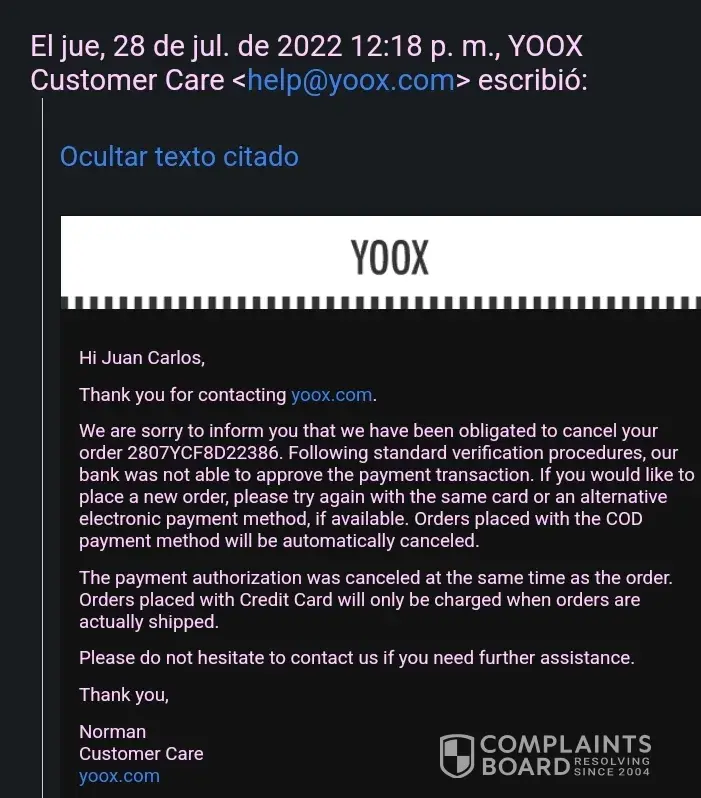 On February 5th, 2022, I made a purchase on their website and received an email confirmation shortly after. However, a few minutes later, I received another email from PayPal about a refund for a canceled order. I checked my YOOX account and saw that the order had indeed been canceled. I was confused because the item I had purchased was still available on their website.