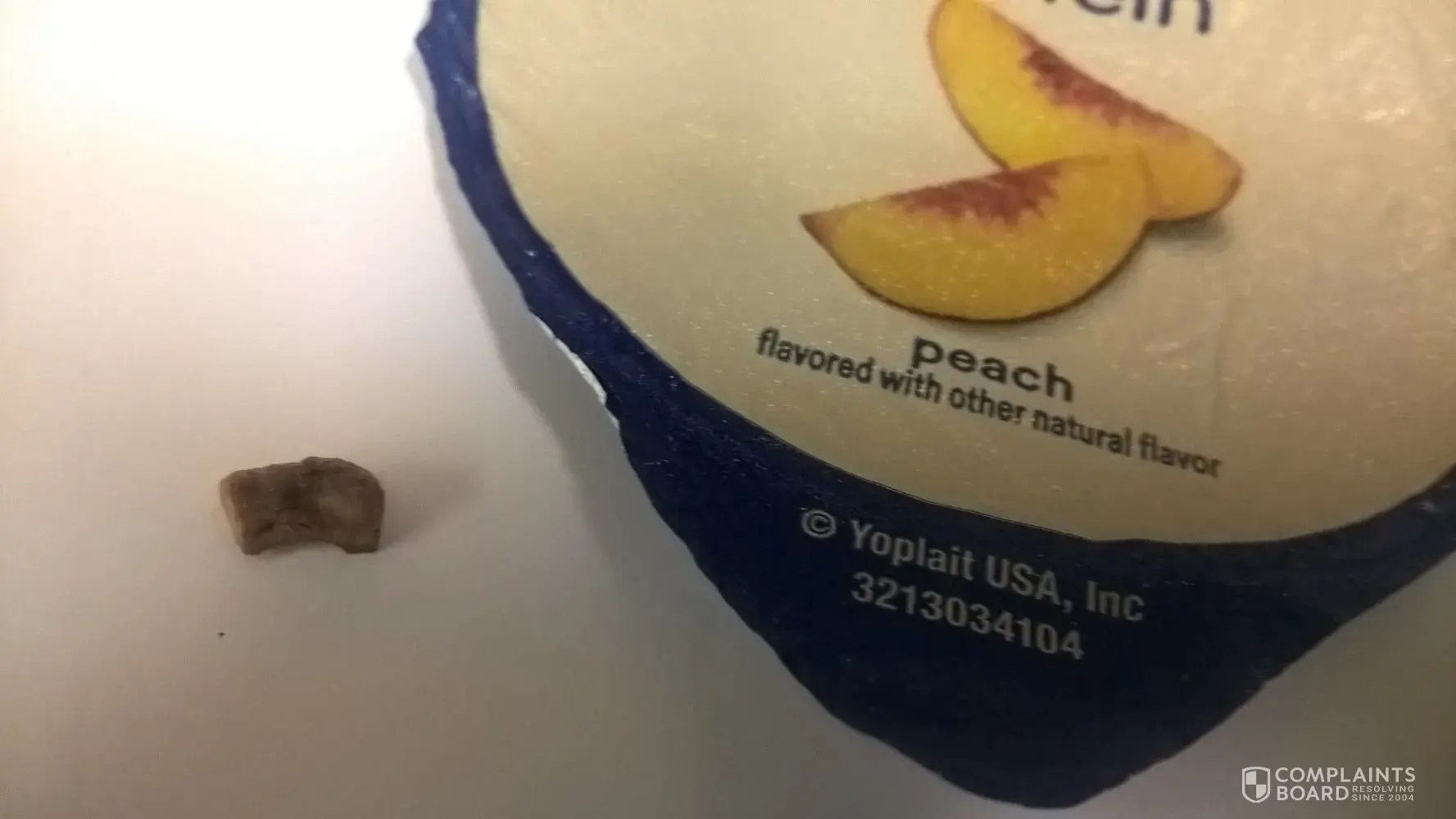 10-9-17 - eating yoplait yogurt and something hard hit my teeth. I split it out. The piece is hard; brownish tan color e.i plastic, glass or rock (size 1/4" long, 1/8" wide)(see picture) numbers on lid #[protected], side of cup #47-190 use by 31Oct2017 MSD1 13:27.