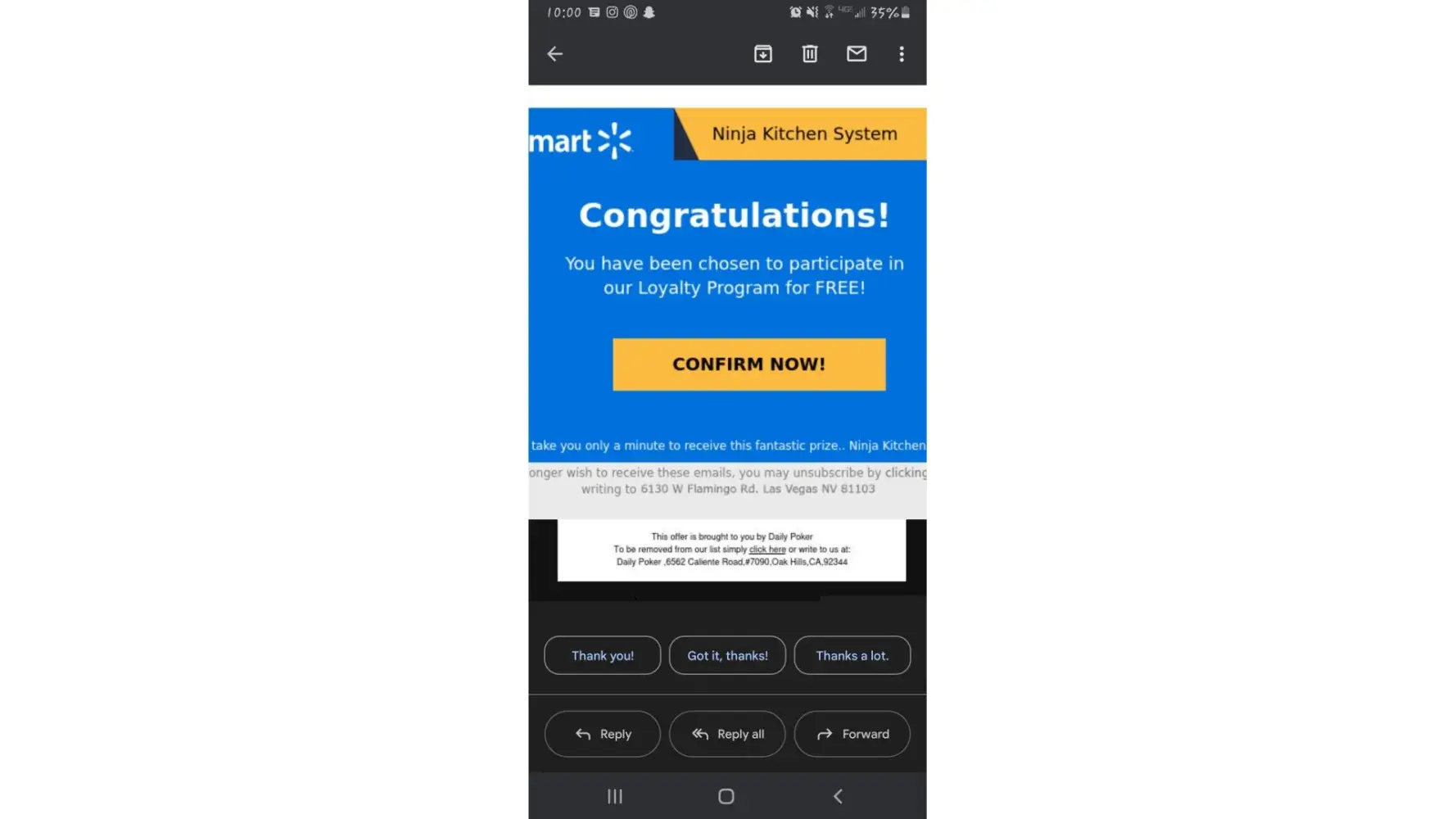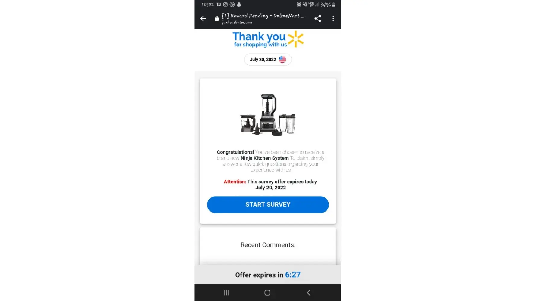 I got an email from what looked like a Wal-Mart add saying that I had won a raffle and got a free ninja blender set. I work for Wal-Mart and thought my job had done a raffle of some sorts and I got excited. I filled out the info and paid the 1$ shipping. A few days later I had $99.95 taken out of my account, then three days later $89.95 was taken out.