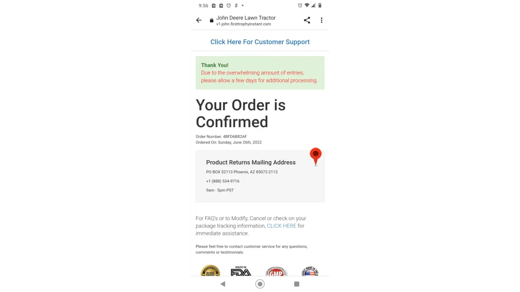 i got an email saying i won a Jhon Deere tractor and just had to pay for shipping and handling and that was only $1.95, the same day $99.95 this was on or the day after Father's day, There was no receipt or follow up email just 2 mystery charges on my checking account