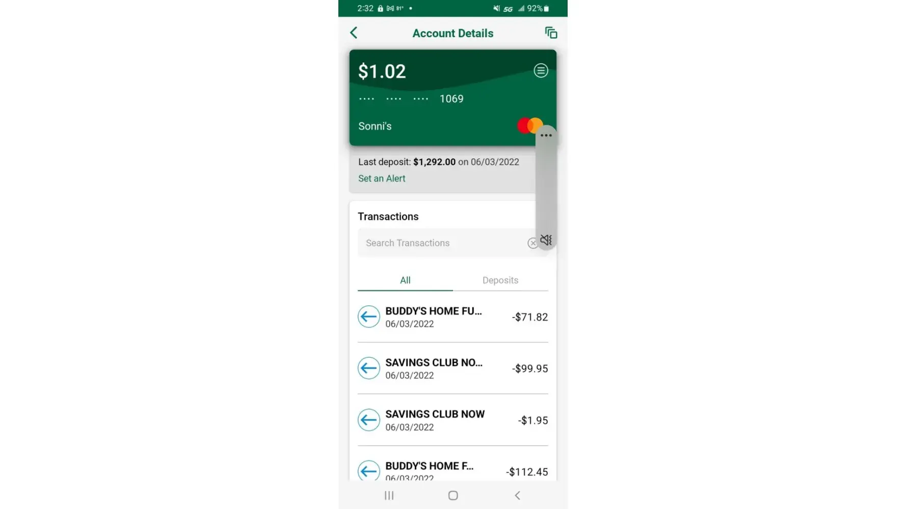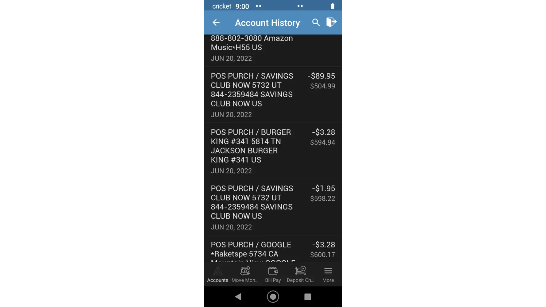 On 6/6, the $1.95 was taken from account. But that was followed by a debit for $89.95 which was not authorized. I have no idea of what the debit was for!