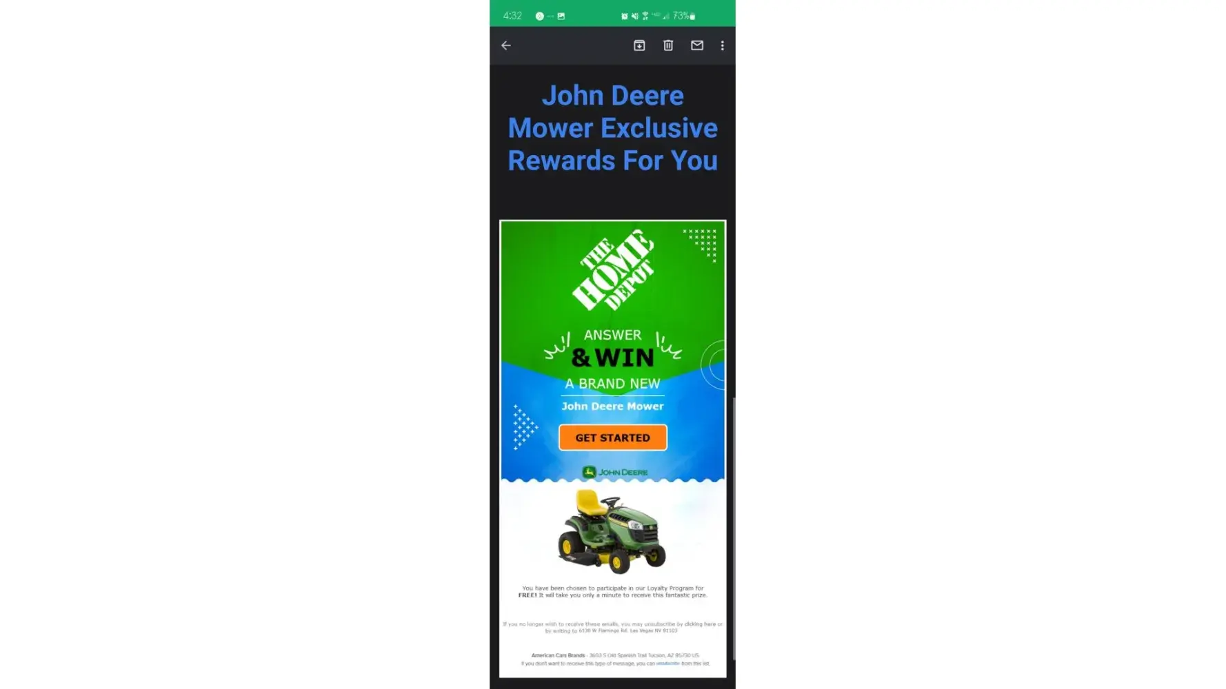 Got a email saying participate in a survey and I would enter a chance to win a John Deere lawnmower. Thankfully used my unlinked Cash App card, which I have frozen and will be deactivating, because I searched after and saw how many people had been scammed by the "Customer Service" phone number for various things. I called and waited on the phone for 15 minutes before it asked me twice to press 1 if I wanted to leave a voice mail. Then it hung up, I did not. About 10 minutes later I decided to check my card again and it declined a payment for $89.95 which I didn't agree to. Thankfully I'm only out $1.95, but it's still hurtful for the people who run personal businesses offering legit rewards for people, like I used to run. Get a life!