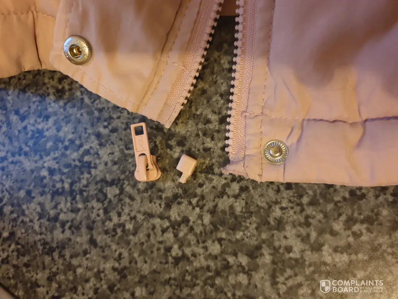 I brought a parker coat in pink with a white hood, took me quite a few months to find a decent coat as I'm so fussy with material and stuff I finally found a coat, cost me £60 so I pick up in store I've gone to out it on today I've had a few weeks bit I out in today and the coat has broke the zip on it has come off I'm so dissapointed because not only have I not got a coat its absolutly shocking weather I realiy on the coat to take my disabled son to school otherwise il be wrote and cold it's so not fair I'm really really upset about this please can you help me