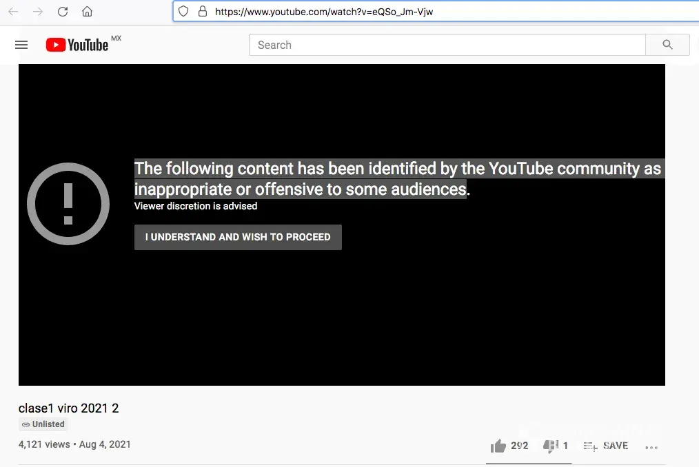 My educational video (a video recorded of one of my university lectures on Virology) has been censored. Specifically, you tube has stated "The following content has been identified by the YouTube community as inappropriate or offensive to some audiences". This material is a lecture on the history of virology, and it was delivered at my university. There is nothing inappropriate or offensive in the content. This level of censorship is meaningless and outrageous. The aforementioned video is: https://www.youtube.com/watch?v=eQSo_Jm-Vjw