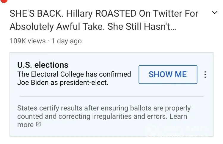 As you can see in the pictures YouTube is claiming this video which is first of all not about election fraud at all is labeled saying Biden won the EC vote but your own link says other wise. This is just down right scummy to try and twist the truth. This is not your place! If you have any integrity at all you would remove this so called EC victory until it is official. I am not associated with this channel in any way I am just a viewer tired of you guys lying.