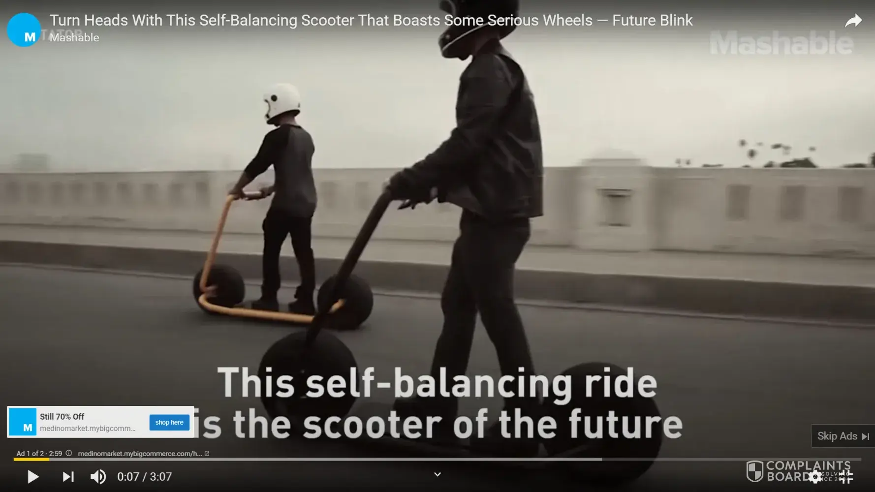 There is an add for a fat wheeled scooter on youtube I paid for 2 scooters then after ten days there website and all contacts ended. No email response no website no scooters. Now I see the same add but when I click on it you get a different website. The first time I clicked on the add it took me to a website that was different than the others but didn't work right. Get this add off youtube.