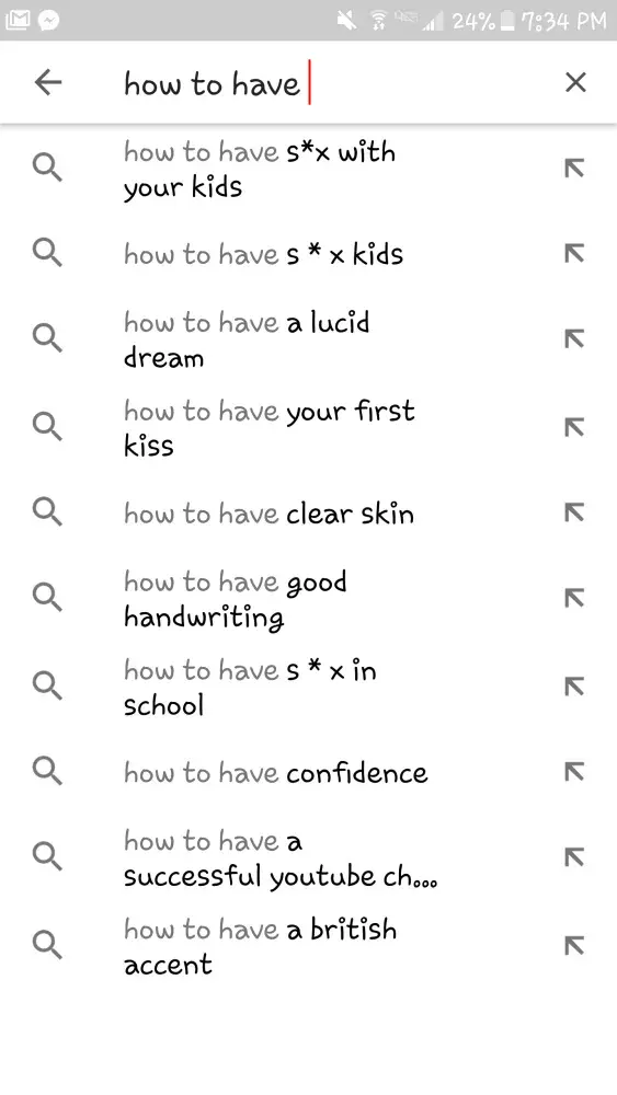 I love youtube vut this is horrible and vile. Went ro the search bar and typed in "how to have" and came up with how to have sex with your kids, how to have sex with kids. I feel that you guys should not allow even titles like this as it is illegal. Its vile, its gross, and it makes me not want to use this app anymore. Like i would like to see this taken care of asap