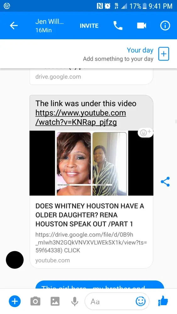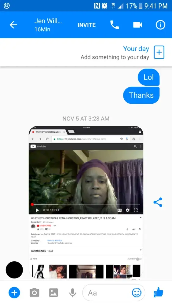 My sister has a mental illiness and has for years. I was sent several links to essie berry website. She has been posting videos of a women claiming to be whitney houstons daughter, and leolah brown stole bobby christina dna. Thr most recent one is rena Houston is a scam artist. I have asked several times that she take theses videos down and she has not. I am asking for help because now she has caused deformation of character on me calling me a liar and all did was try to ecplain that my mentally ill SISTER was lying. And my family been dealing with this 4 9 years. Please remove all videos with rena houston and whitney houston has a daughter, our family is resuing legal remedies at this time over 15k people have been these videos and we have been receiving death threats behind these lies she continues to help my mentally ill sister spread. If they are not removed we will assume u are in agreement with her and we will include u in the legal remedies. Thanks so much.