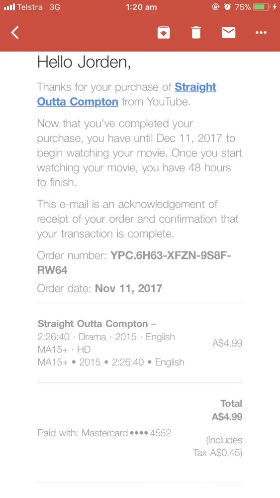 I purchased Staright outta Compton at the cost of $4.99 on the 11/11/2017 at 10:06pm with