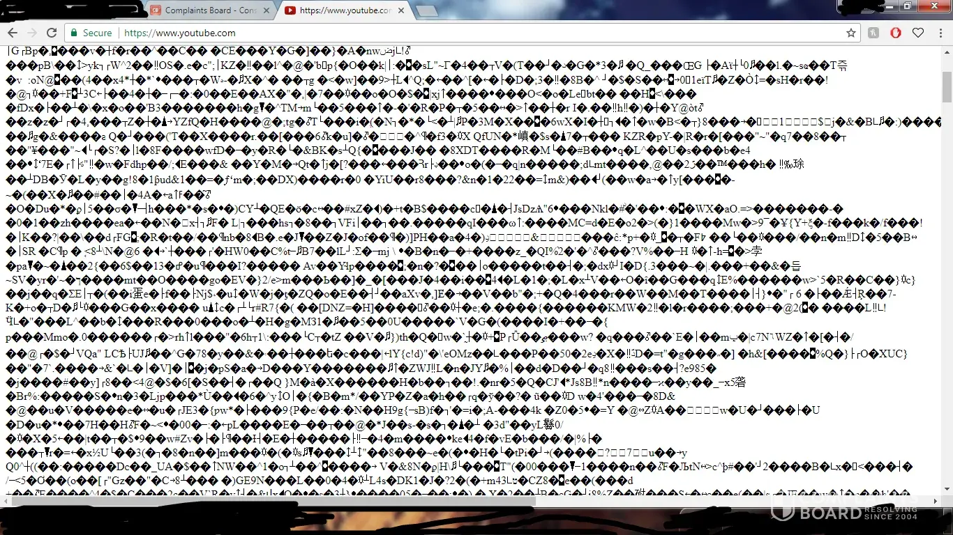 When I try to go onto the Youtube page, by typing in www.youtube.com into the search bar of Google Chrome, it takes me to a page with a whole page of coding lines that look like this: "9��(����p���z7����3ʴi7��EbH� qd# ���/����z�L)T����3{��P�a�hr�ѿ���c �"