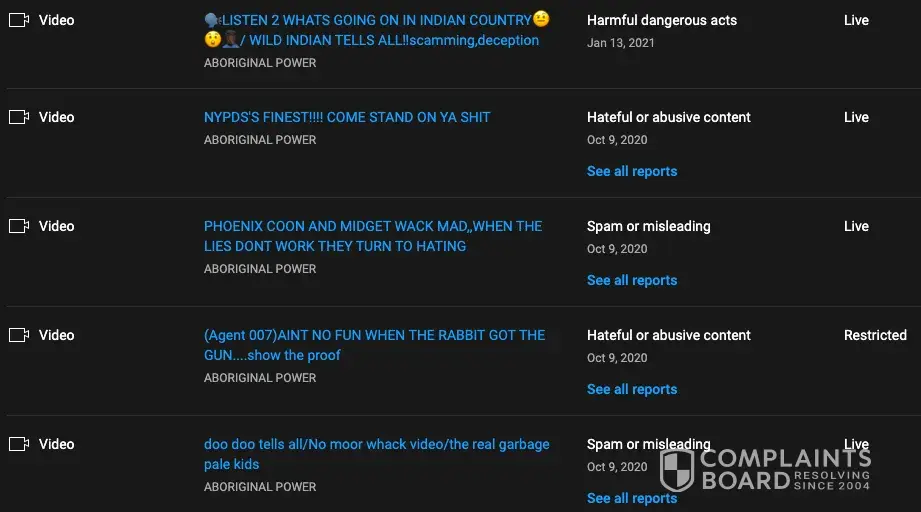 a 90 restricted user who has been harassing myself my business and other victims. during this process which I have now taken legal action along with contacting the federal government and stopbullying.org I have extensive documentation proving gross negligence and the gross delay in response to my claims. 90 restricted user url {https://www.youtube.com/results?search_query=aboriginal+power} the user has taken the liberty to knowingly and willingly violate policies procedures and guidelines advertising and promoting a new channel to subscribers during this 90 restriction {https://www.youtube.com/channel/UC8oWnGC-BV2hRpdWFTL-00w/community} {https://www.youtube.com/results?search_query=the+big+aboriginal+power+news} {https://www.youtube.com/watch?v=gIEeXiDPHQg}