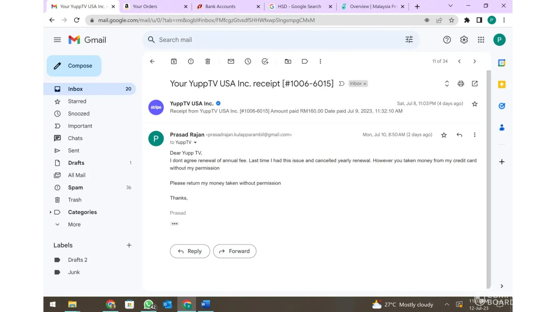 Please send us the YuppTV login id with which you subscribed. I would appreciate if you could let us know when you sent the request for cancellation. Please mail the details at support@globaltakeoff.com