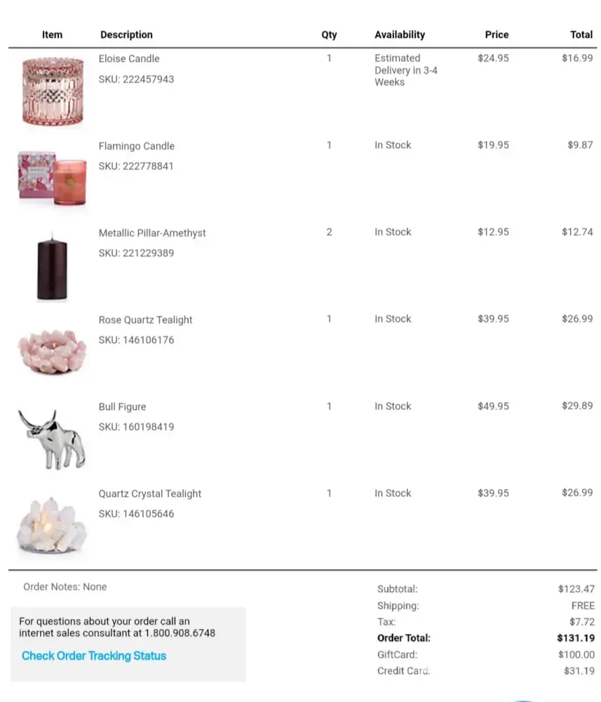 I place an order in August 2019 aftee receiving a giftcard Some of my items didn't come. I called, they said I would get a giftcard for 2 of the items they no longer have and they'd ship out the other item. The item was a candle, I received pillow cases. I was instructed to return the pillowcases & my item would be sent. No item, no refund, no emailed giftcards as promised. Many, many emails and long drawn out phone calls. As of 11/13. No response.