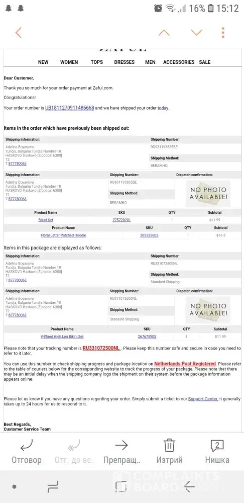 On the 27th of November, 2018, I ordered some pieces from your website. I received an e-mail with my order details. My order number is UB1811270911485668 and my tracking number is RG931193835BE. From then I've been waiting for my purchase to be delivered, but I haven't received non of the thing I ordered. I paid by debid card, so you took my money, but i didn't received the things that I paid for. I paid around $40 for the 3 things: a hoody and two pieces of bikini swim suits. I will detach a photo of the e-mails you sent me. I will appreciate it if you respond to my e-mail. I will be vary happy to finally receive the things I've ordered. You can contact me here on my e-mail: [protected]@abv.bg or you also can use my phone number +[protected]. My address is Tundja â„–18, Haskovo, Bulgaria. I'm looking forward to receiving an answer from you.