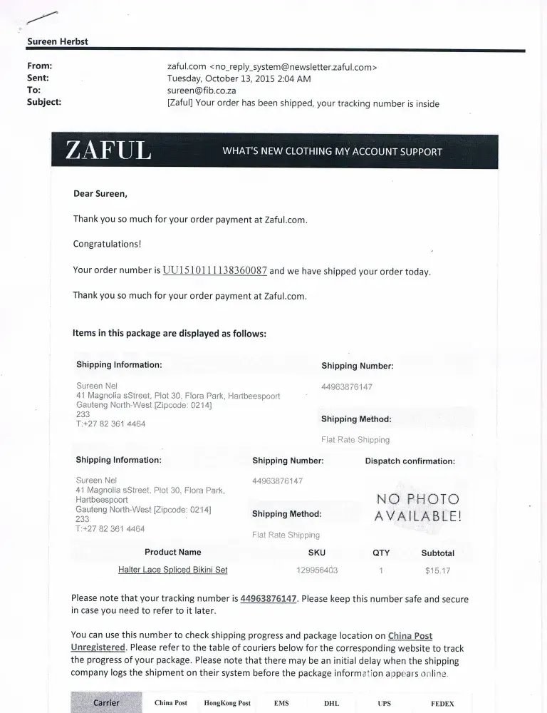 I bought a swimsuit from Zaful and never received it. I spent days just trying to get in touch with somebody from customer service. When I finally reached someone they said that they have no idea why my item was not delivered and said that it was not their fault. They said that they can send me another swimsuit but I have to pay for it. I was told that there will be no refunds. What a joke! I will never order anything else from Zaful. Their shipping service is horrible, not to mention that products they sell are poorly made and quality is absolutely rubbish. Sizes are very small and sometimes items are also damaged. Don't waste your time and money. Zaful is just another disgusting Chinese company, avoid it!