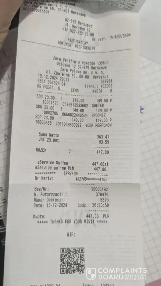 I ordered two specific handbags from Zara Spain (order #53859800625, placed on July 27, 2025). Instead of receiving my handbags, I got FIVE completely unrelated clothing items. This was clearly a packing error in their warehouse – not a shipping mistake and definitely not my fault. I contacted their customer service multiple times, explaining the...
