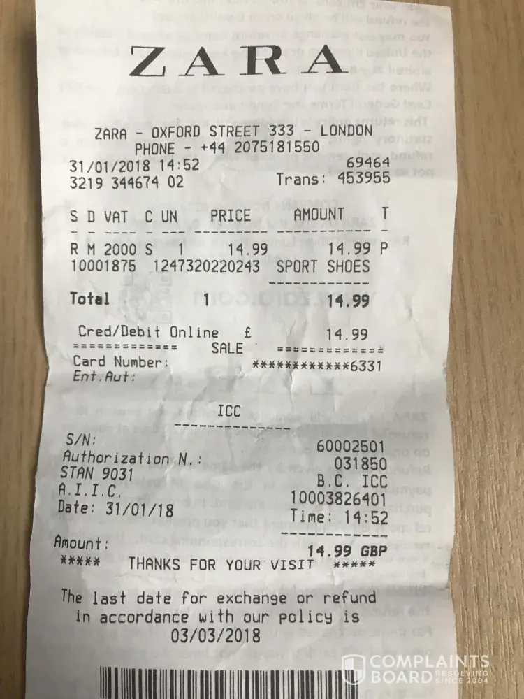 I believe Zara is reputed company and it is unfair for as a customer and customer does not expect from Zara this kinds of mistake and solve the problem with fairness.