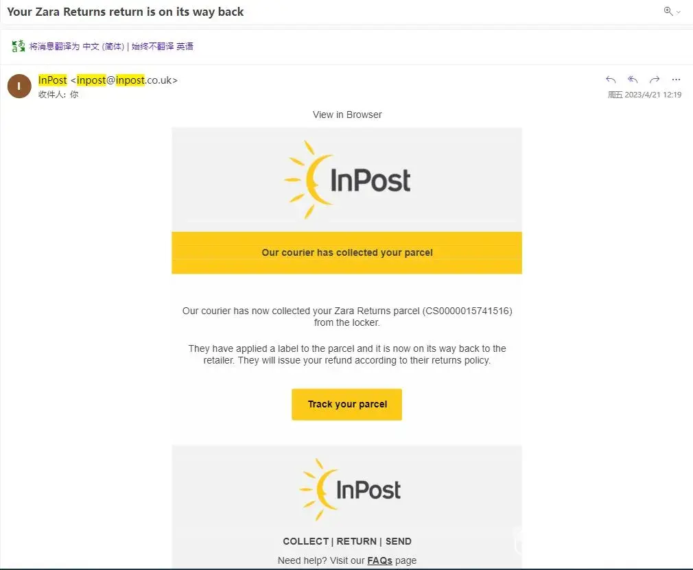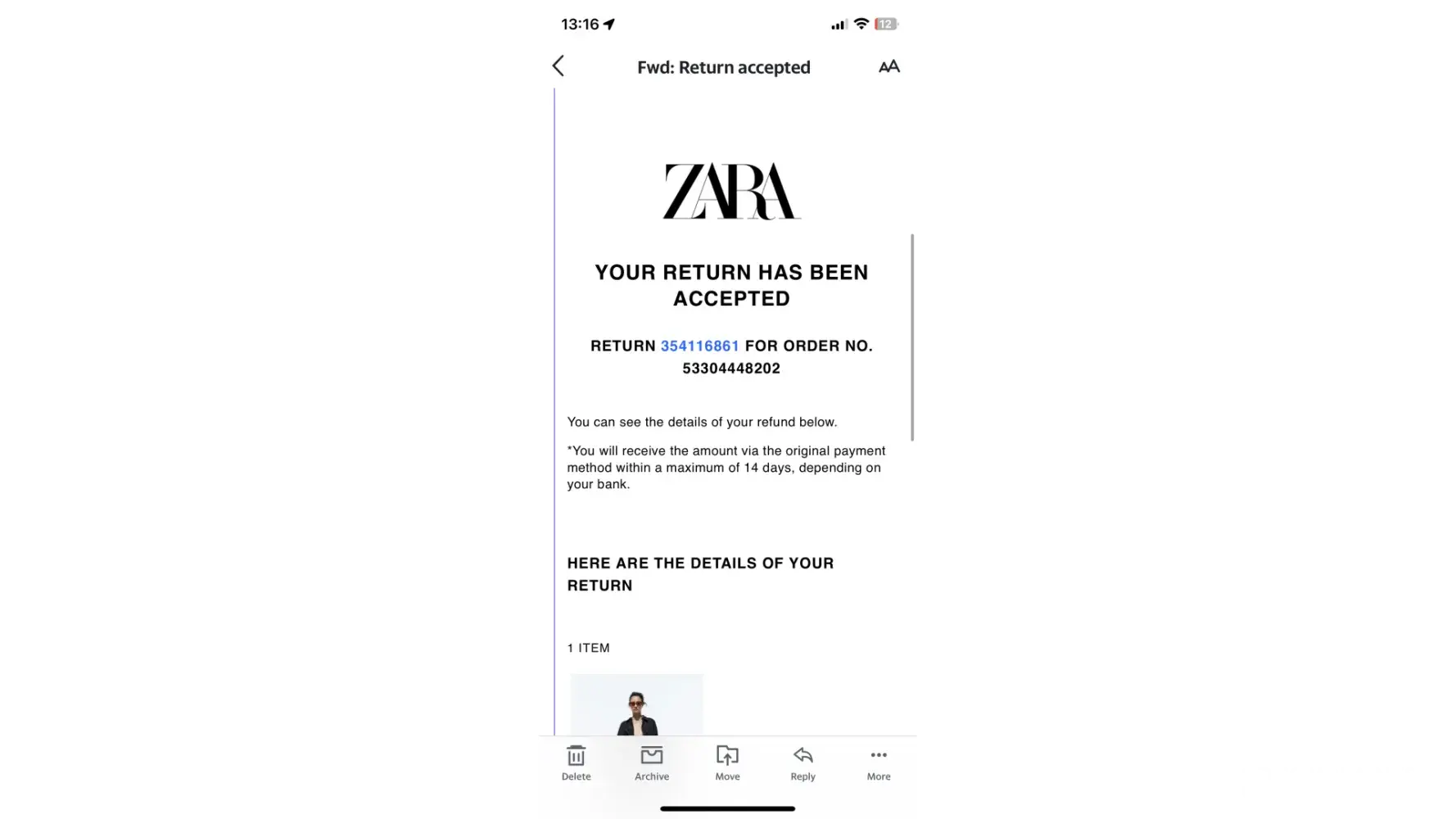 The issue that I have experienced was: I have made a return for several items from Zara on 20 April. However, I haven't received the refund for one item with the reference number 1255/816 (FAUX LEATHER TRENCH COAT 89.99 GBP). I can confirm that I returned it through the InPost drop off. I also have the return receipt from the InPost. I have two return receipts since I made the return (RETURN NUMBER: [protected]) in 2 boxes, which are Parcel Number: CS0000015741516 and CS0000015741519.
