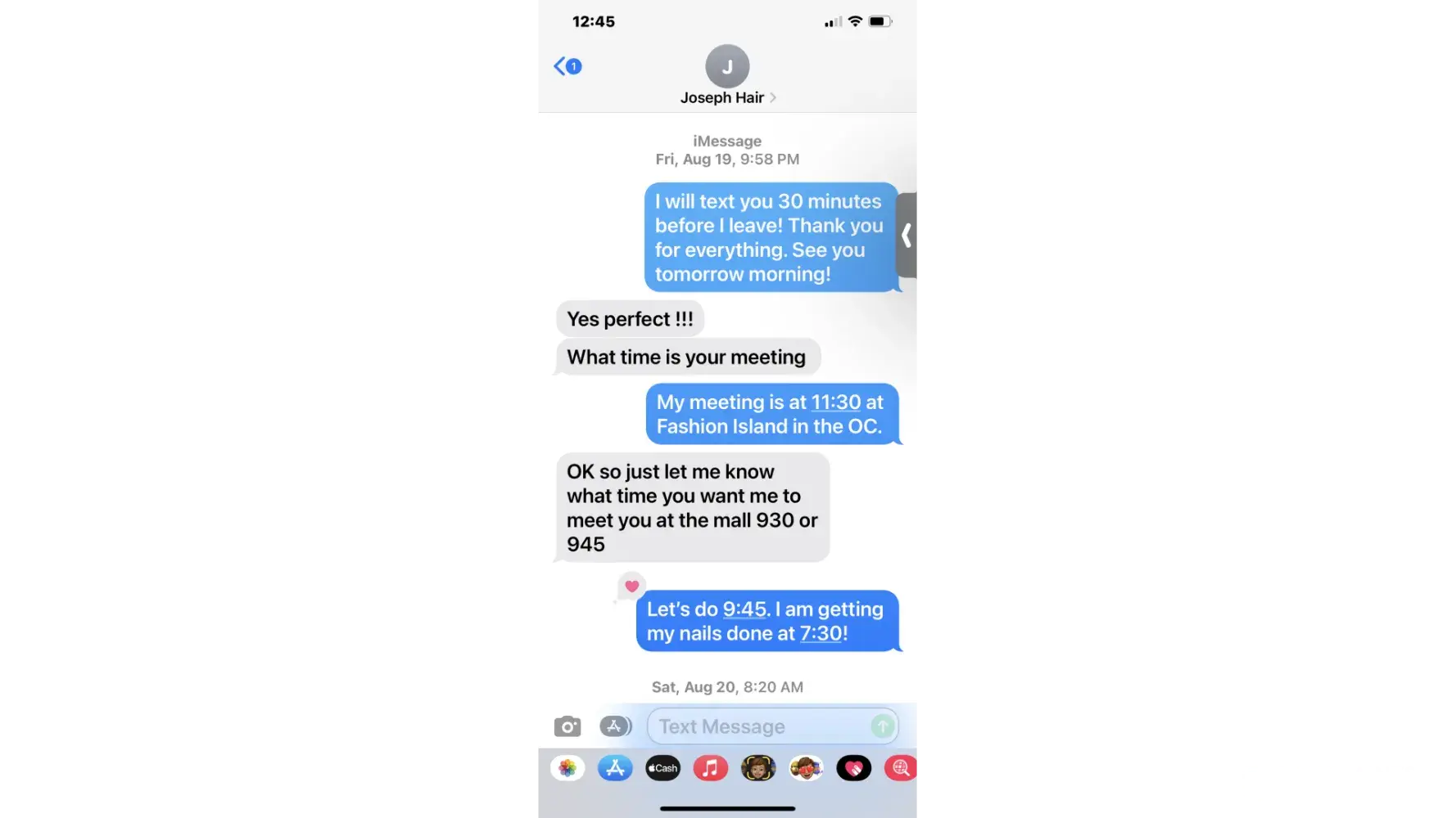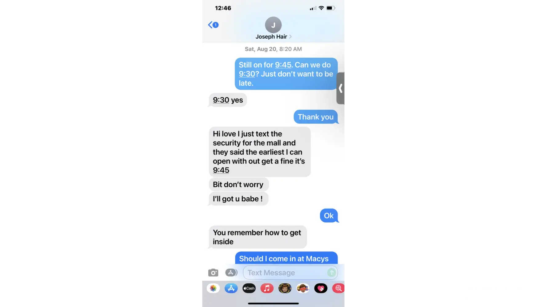Joseph said that he owned the company and I agreed to come back to the kiosk in the morning, and he would do my hair. I thanked him and completed my shopping in the mall. He gave me his telephone number and told me that we could meet at the mall at 9:45. I texted him and asked him if we could meet instead at 9:30 just to make sure we would have enough time.