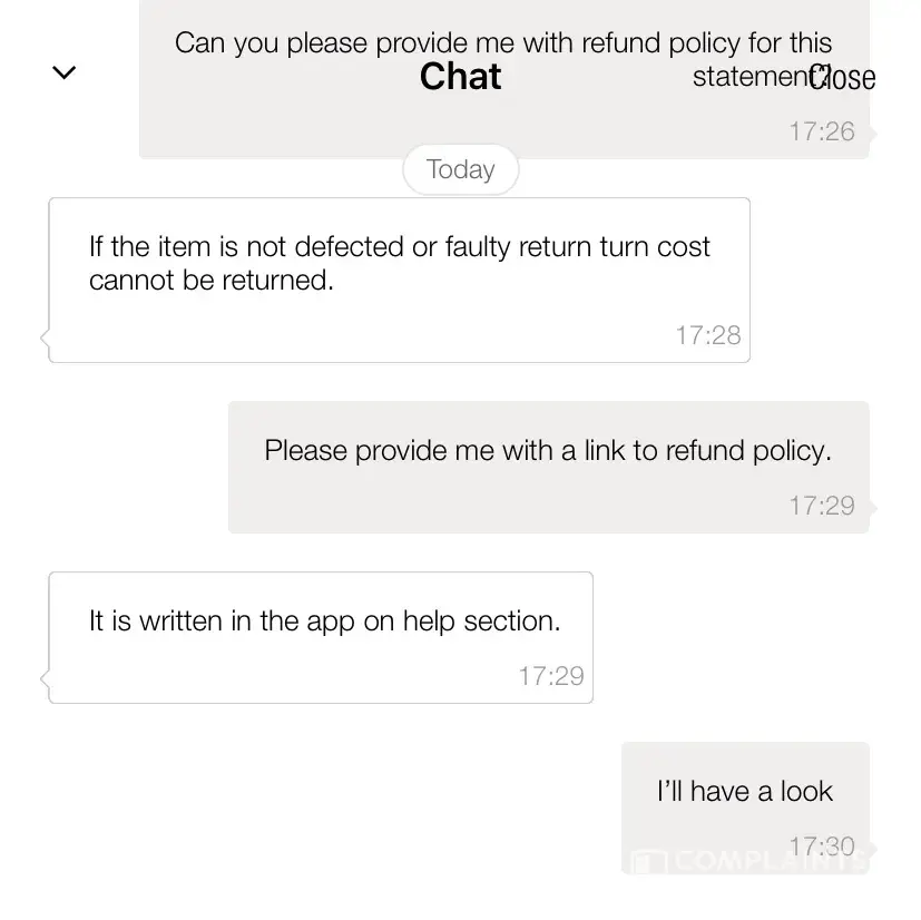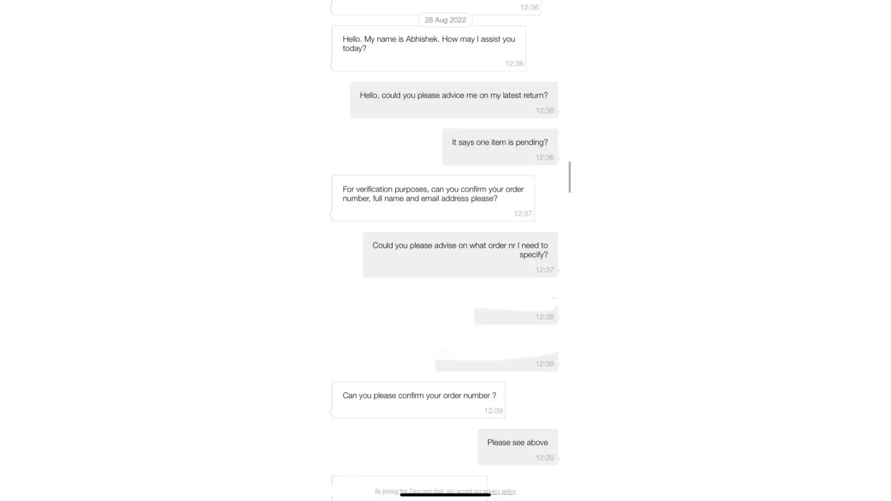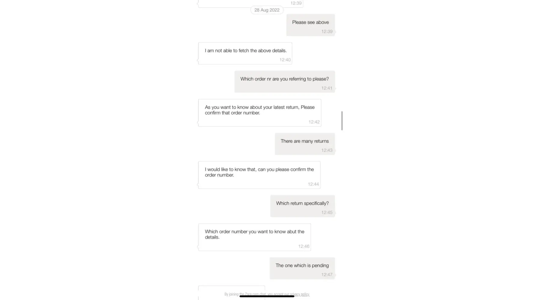 I read through the Refund and Exchange Policy and was not able to find a piece of relevant information, therefore I called Customer Service on [protected]. Unfortunately, a representative wasn't able to answer my question and didn't seem to listen to my queries. I told him that I read through the Refund and Exchange Policy and was not able to find the statement, that he was repeating to me constantly. When I asked where this information come from, he just thank me for contacting Zara and put the phone down.
