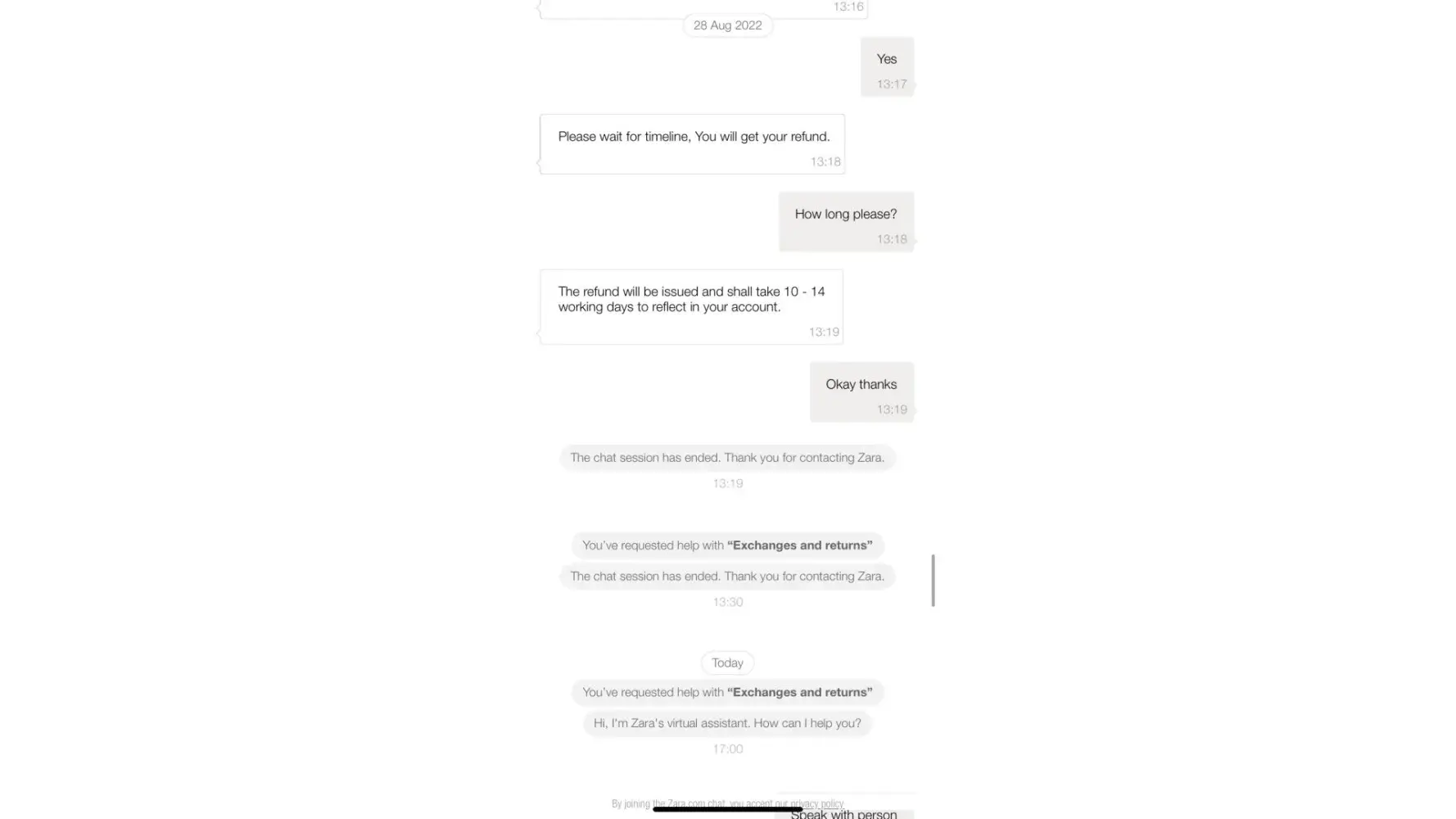 I'm a loyal customer of Zara for many years and haven't encountered anything like this before. It really makes me think that Zara is employing young people who are not competent in customer service and not knowledgeable in the Terms and Conditions of the company, which is really sad.