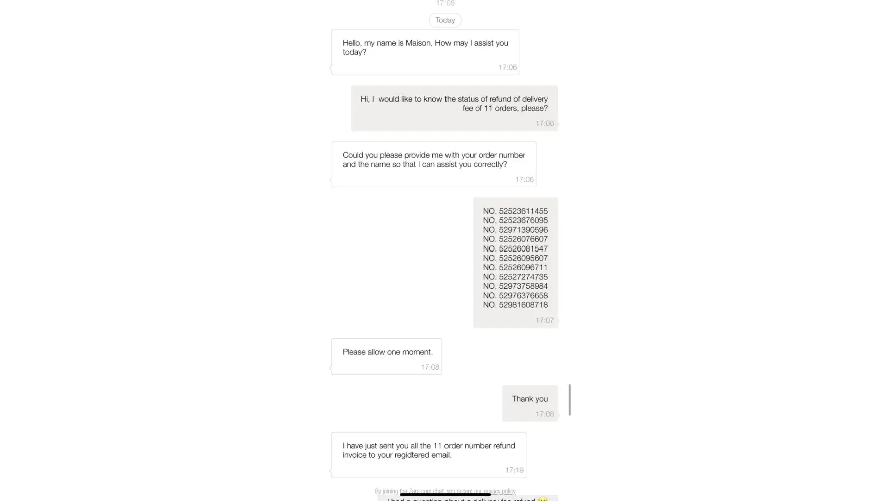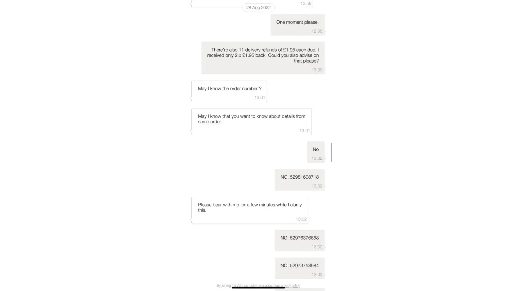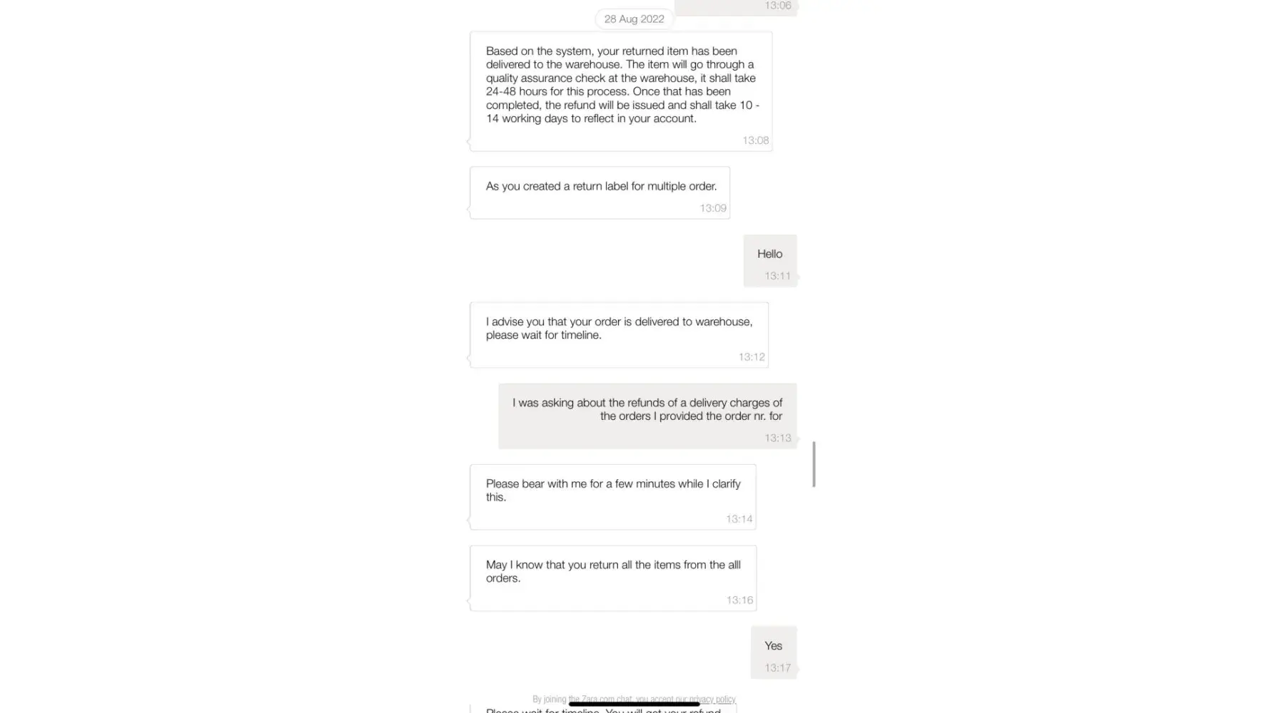 On August 28th I contacted Zara with a query about a refund of a delivery charge for 11 orders of £1.95 each. A representative didn't seem too knowledgeable and competent in the question. I have been told that I'd get the refund within 14 days.