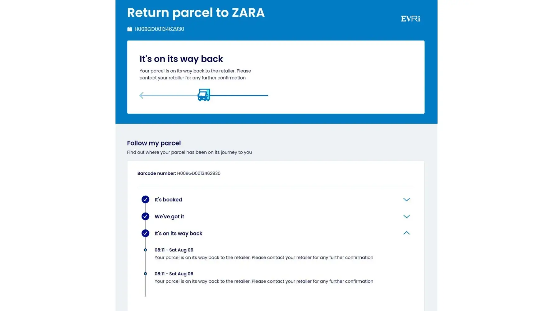Dropped off at parcel shop on 04/08. Evri Tracking Nos below.