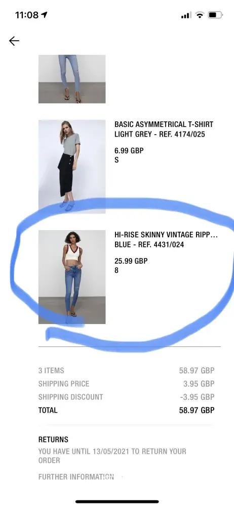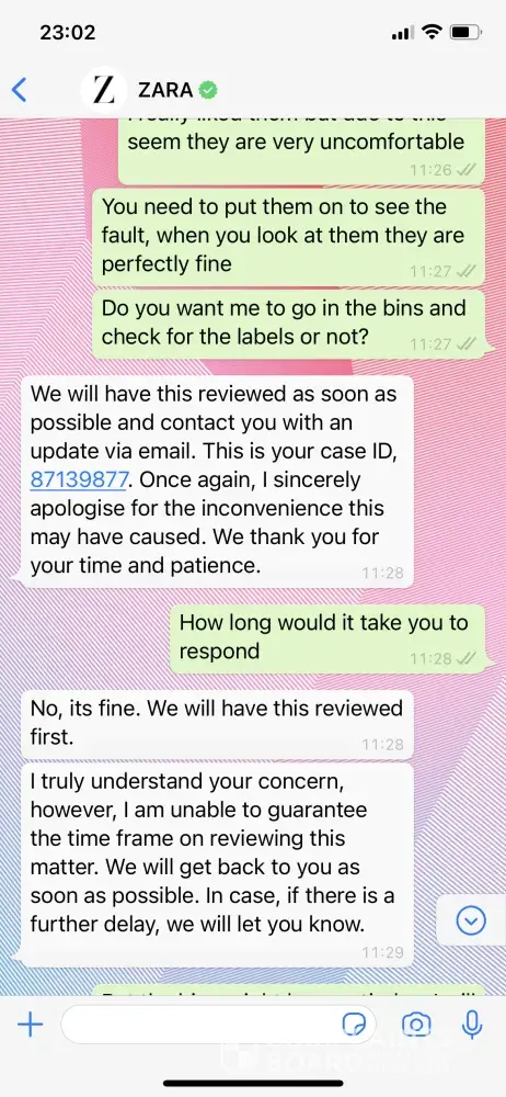 I received my order in less than 48 hrs, tried the jeans, perfect fit, cut the labels as all the Zara labels are way too long and itchy. Upon wearing them for less than 1/2 hrs I felt that the seem on the back is pulling to the left side and it was uncomfortable to wear them because they haven't done the stitching properly. I contacted zara WhatsApp and specifically asked the customer service do I need to go to take them out of the bin. She said NO. Now they are saying that they cannot do anything because the labels are cut. It is breach of my statutory rights s9, s10, s49 CRA 2015. There is nowhere clearly stating in their terms and conditions that the labels should be attached. I am diabetic injecting my insulin mostly in my upper tights and I always cut the labels not to cause any infection especially Zara as their labels are too long and itchy. It is outrageous how they do that. I have never ever come across something like that in my life. I hope you could resolve this or else I will contact consumer ombudsman. It is not tight to do that. I can send you photos of the chat where you could clearly see that she has told me not to go and get the labels.