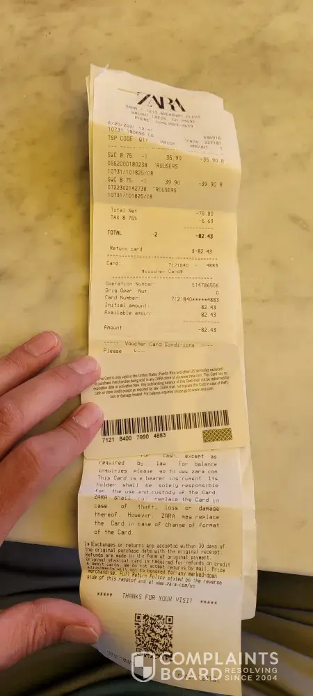 (if the name is correct that she said). I left the shop very disappointed and decided to call the head office number 00357-[protected], a lady advice me to report my problem by email and said nobody will speak to me, that's the company policy, no manager will accept talk to me was made clear, shocking situation from a big company Zara. In the end she decided to ask my name and telephone number and said a member of the management will contact me. From the 11/02/2021 When I made this telephone call nobody ever came back to me, the person I spoke to the phone did not accept to tell me her name when I ask for it. This is unbelievable in our days the meaning of customer service from the day one till today was nowhere. Please note that my item I bought and paid still in the shop and nobody replied to me. I am looking forward to your soon reply. I am really disappointed with the non honest manager in the shop which clearly told me that only if the item was bought today she can reprint the receipt or give me the exchange card, I am disappointed with the lady I spoke on the 11th February which she did not accept to give me her name and I am really disappointed that till now nobody contacted me from the company. I am sure this is not how Zara would like the staff to treat their customers. Looking forward to your soon reply.