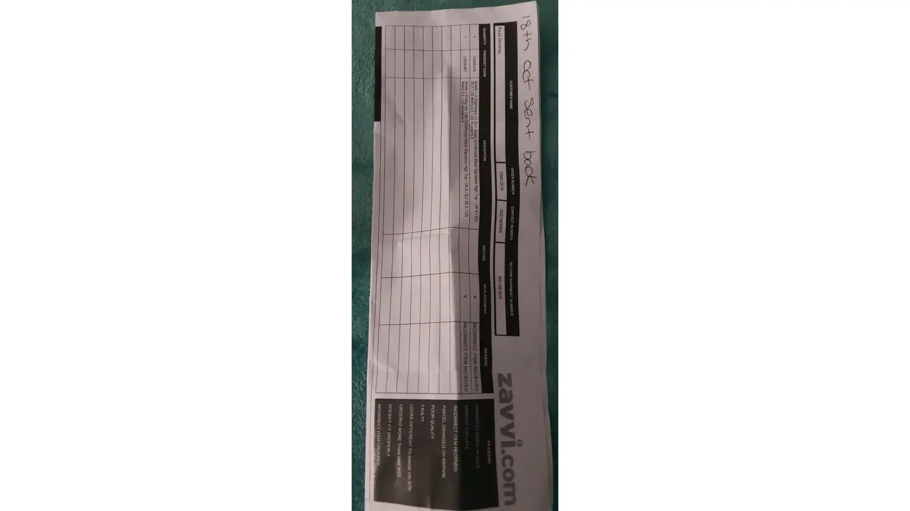 Zavvis mistake sending wrong size, too small...I ordered correct size...my receipt and the form used to return hi tops to them..