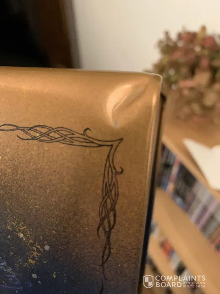 After years of accepting damaged items from you (including the same inexplicable scratch down many steelbook spines - see photos of just a small few), I have today received the Lord Of The Rings trilogy steelbook set and it has arrived dented. I know it's long sold out so cannot get a replacement but I want this complaint acknowledged and some form of recompense.