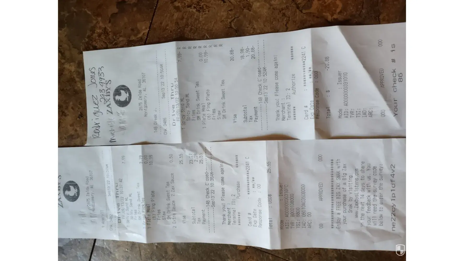 Anyhow, I explained the issue and after lying to me stating they were working on my order, then telling me my order number was something other than what was on my ticket, she finally stated they had lost the order. At that time I asked for my money back. She stated she would have to put the $$ back on my debit card, which I declined (because it can take up to a week to show up). I asked her to refund my money on a gift card. She called her district manager who informed her she could only put it back on my card or give me her district managers name and number. At that point I told her to give me the food. When I received the food, the grilled chicken on the salad was cold and we didn't even receive forks for the salad and the coleslaw! I have had issues prior to this with the Zaxby's in Calhoun, which refunded my money on my debit card, right away due to hair in my salad!