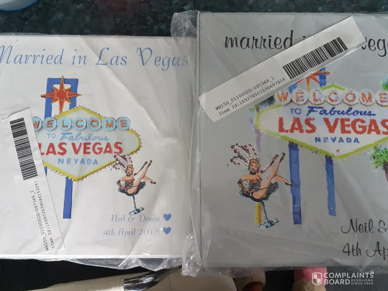I had ordered a gift for my daughter who married in las vegas i had ordered these 2 personalised wedding albums 1 for me 1 for myself a was totally shocked what i was given its 2 plastic binders with nothing yo put photos in 1 was $22.95 & $21.75 so a total of $44.70 didn't say anything about shipping costs so then it takes $39.95 for shopping doesnt turn up on time then when it does a got charged £23.35 in English money thats nearly £90 in our money a was absolutely disgusted e-mailed to complain told me they couldn't take complaints so now a wd like full refund for everything that i had to pay these are such bad quality am so embarrassed and feel like a full a never give anyone bad reviews or complain but this is ridiculous. Linda Rice