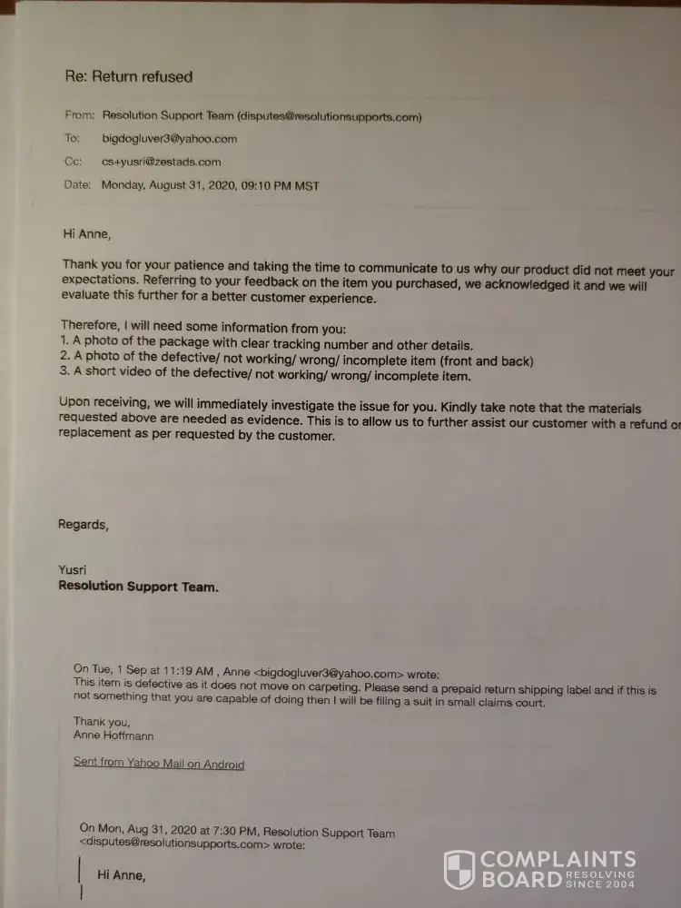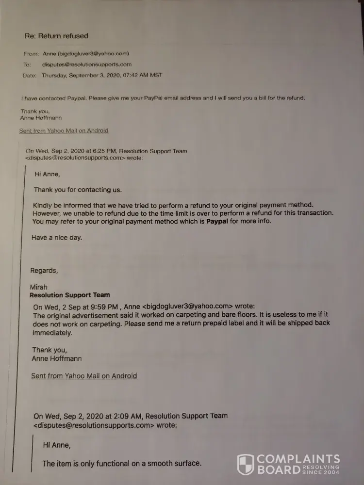 I also purchased this piece of junk Lunavac! I tried sending it back and it cost me $43.00 only to have it refused and returned to me 4 months later! I emailed disputes and they emailed back and forth with me and asked for pictures and a short video of it not working. I sent the pictures and the video of it not moving on the carpeting and they sent a video back showing how to make it work and said it will only work on smooth surfaces. I told them that was false advertising because the ad had said bare floors and carpeting. I am requesting a refund for the purchase price of $105.90 but would also like to get the $43.00 that I spent to ship it back only for them to refuse it. I originally purchased this through PayPal on March 2, 2020. I have attached the receipt and the video of it not working. The PayPal transaction ID is 1UV9682785314263A Anne Hoffmann [protected]@gmail.com