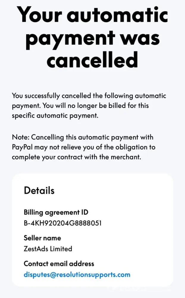 Whilst using my iPhone a notification popped up showing a PayPal monthly automatic payment of £45 to ZestAds Limited. I did not authorise this payment, have no idea who ZestAds Limited are so promptly accessed my PayPal app and cancelled future automatic payments ( that was shown as a direct monthly payment to ZestAds Limited). Since I successfully...