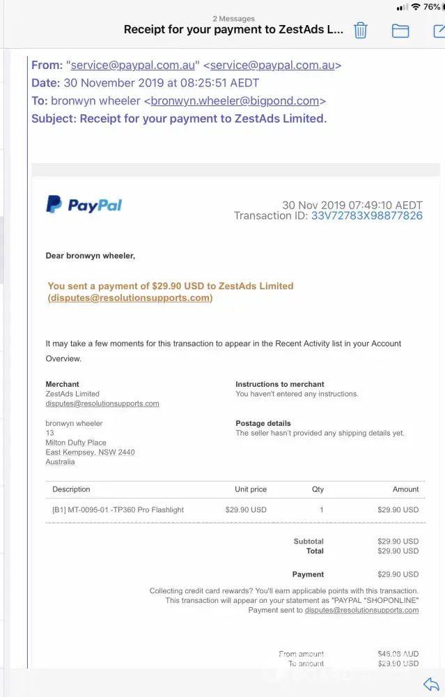 On november 18, 2019 I purchased 2 small space heaters for a total price of $115.93 through zestads limited (paypal shoponline #[protected] hk) reference #74423429322945914114568. the tracking number #lw89294478cn on 17track.net states it was shipped on november 21, 2019. as of today, december 23, 2019, it has not arrived. any assistance is appreciated. I emailed them to try and resolve this issue and I get a crazy response that their email is backlogged and they will notify me when shipped.