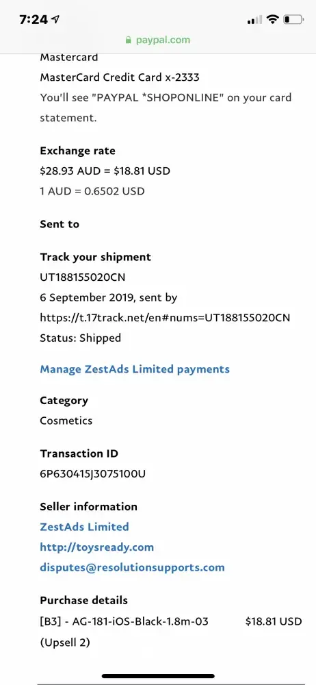 Ordered two of these virtually unbreakable phone charging leads and payment went through PayPal on 31st July 2019. It's now October and no goods delivered and the shipping/tracking information never came either. I want a full refund of the $26.76 immediately please and an explanation would be good too. I attach proof of the payment, the company. product and transaction number with dates below.