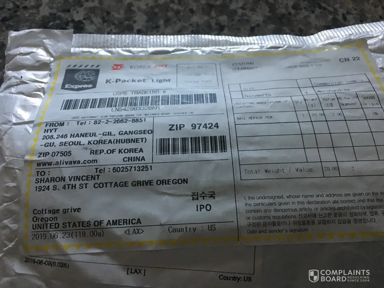 Received in the mail - 2019-07-23 [B5} HPS-134-05 NailFresh (Monthly#1) Value $27.85 TEL: 82-2-2662-8851 HYT 245 HANEUL-GIL, GANGSEO-GU, SEOUL KOREA (RETURN TO SEOUL IPO) HUBN ZIP 22381 REP. OF KOREA www.alivava.com CHINA