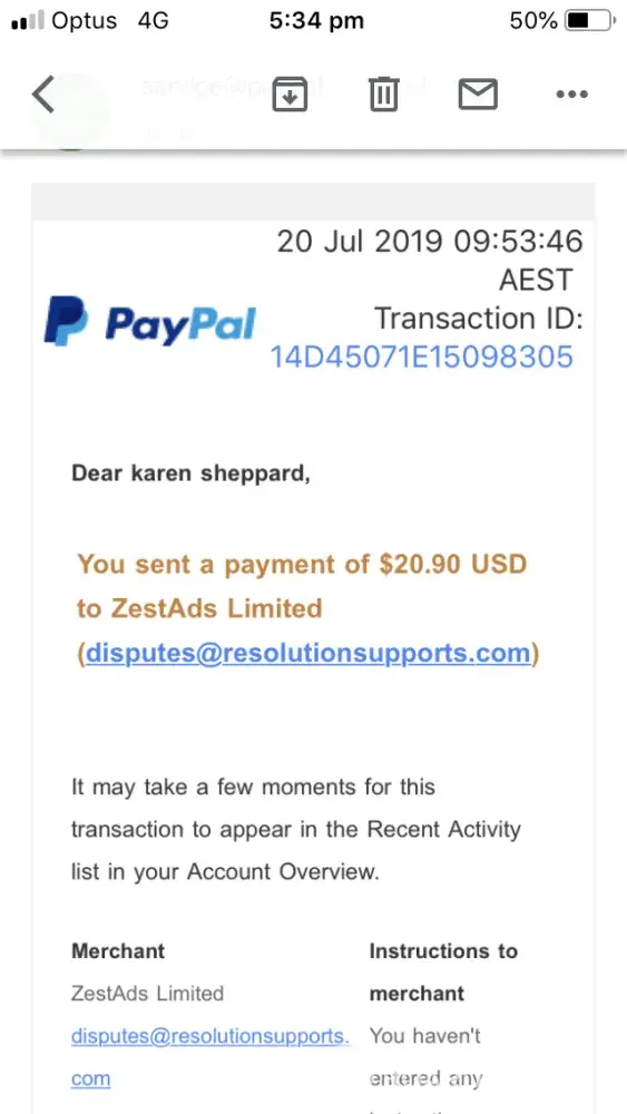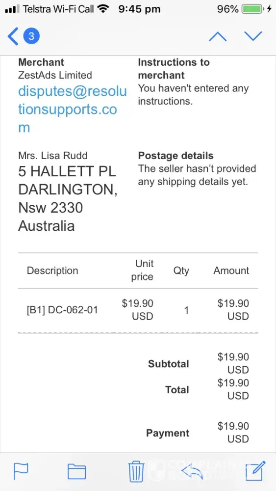 Placed this order on July 9th and paid with PayPal - Transaction #7HE62020NA611115B. I never received a confirmation, have not received the item or a possible shipping date yet it appears they have my money. I contacted PayPal to dispute this purchase and have heard nothing back. I have also sent 2 emails to [protected]@resolutionsupports.com which I assume belongs to ZestAds Limited since it is under their name on my PayPal confirmation. I either want to know that the item is being sent and when OR my money refunded.