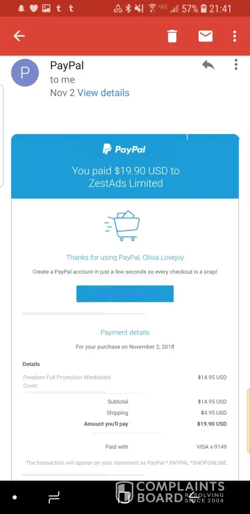 Also cheated by the same Zest ads Pay pal will not protect you from such scams NO REFUNDS