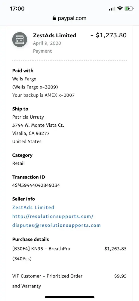 On 4/2/20 I ordered an N95 mask from ZestAds Limited and paid $49.90 through Paypal. My order # 4204625492748927005302010000638530.