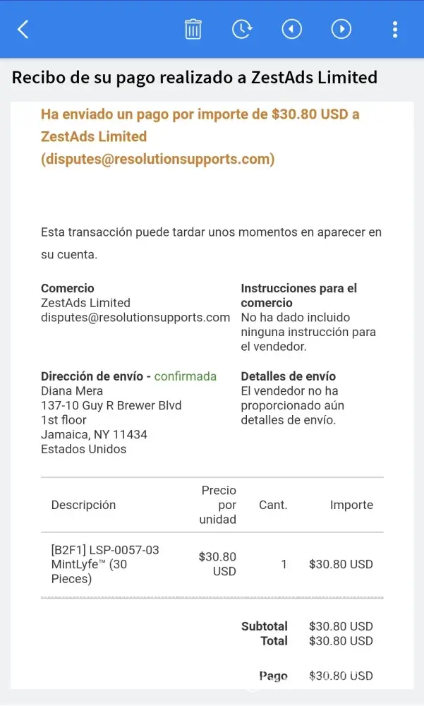 Buenas tardes el 25 de Enero pedà los parches de menta por un costo de 30.80 y hasta la fecha no recibo ningún email de confirmacion del pedido; numero de envio ni nada al contrario me cobran 26.95 dolares más. Necesito una respuesta urgente