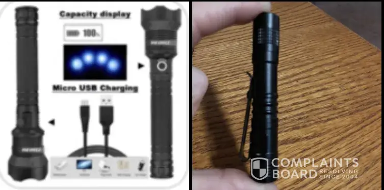 I ordered the same advertised flashlight for them and receive 2 little flashlights that require a AAA battery. Not even close to what was advertised. Huge scam.