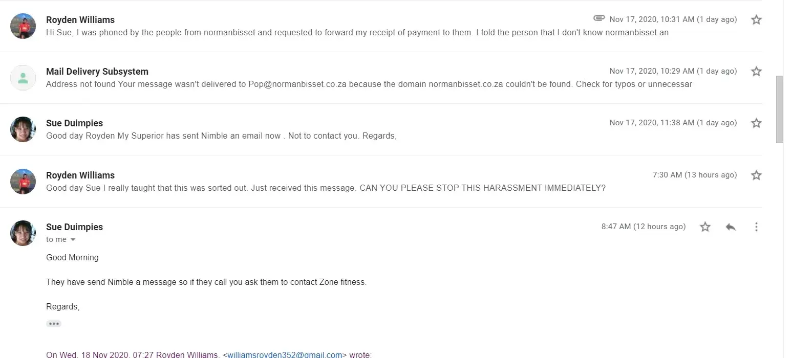 I made my final payment of R758 on Saturday, the 14/11/2020 as requested by Sue Duimpies with email address: [protected]@zonefitness.co.za. However, I am suddenly getting SMS messages and phone calls from Norman Bisset Attorneys. But Sue from ZoneFitness indicated in an email that these messages and phone calls would stop but this is not happening. Furthermore, Sue from Zonefitness indicated that I must refer any calls, back to Zonefitness. This however has not prevented the harassment calls and SMS from stopping. ZoneFitness must sort this out. Please Assist.