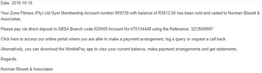 Today, 15 October I receive an email from Norman Bisset & Associates stating that I owe Zone Fitness R3612.00.