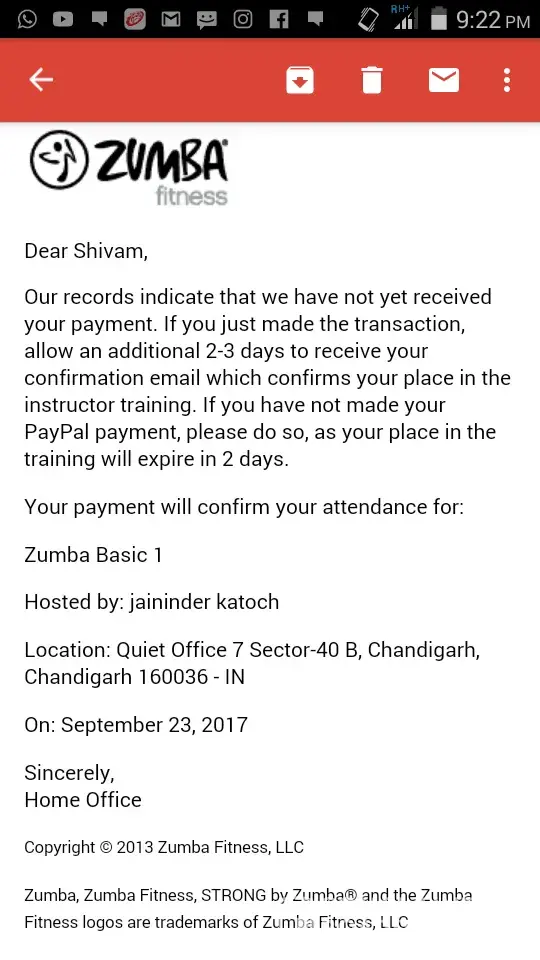 Than Again I had applied for chandigarh zumba certification training I had to give 35$ extra for it I had pay through PayPal but I have not got confirmation email yet for zumba training in chandigarh what should I do now please help as soon as possible because training is on this 23 and 24th September.