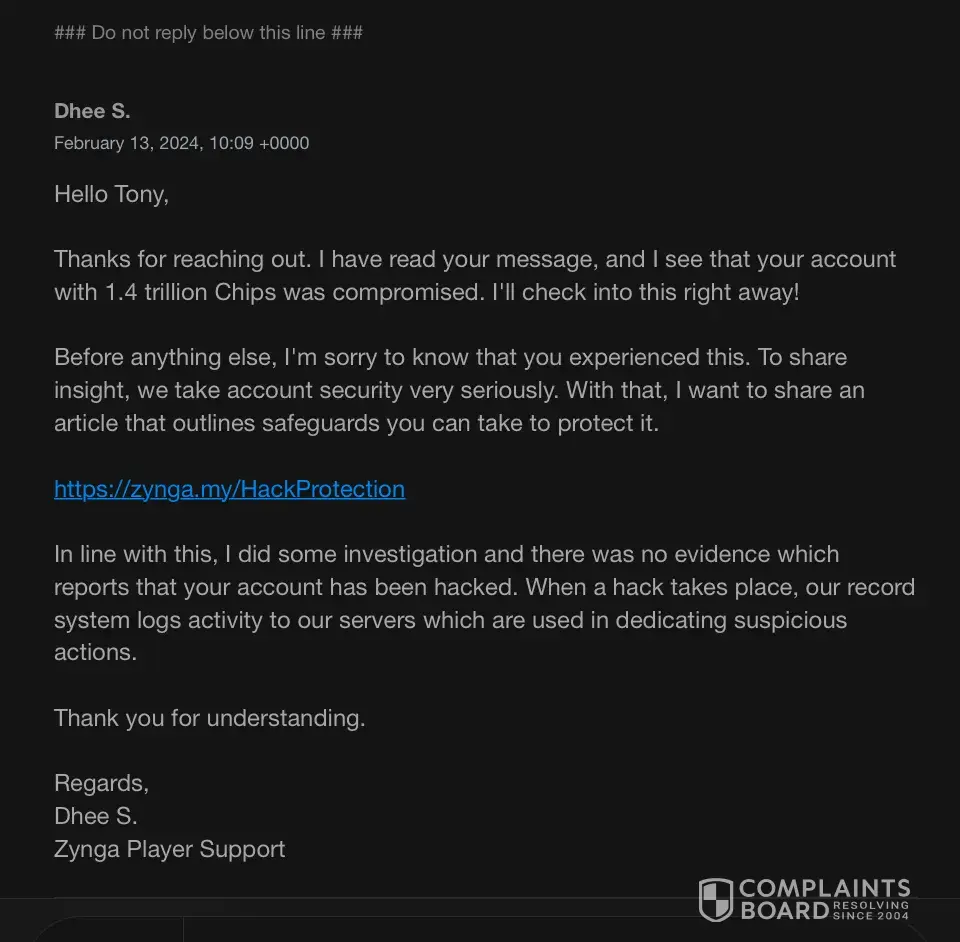 - While Zynga has a high level of trust, our investigation has revealed that the company's complaint resolution process is inadequate and ineffective. As a result, only 15% of 444 complaints are resolved. The support team may have poor customer service skills, lack of training, or not be well-equipped to handle customer complaints.